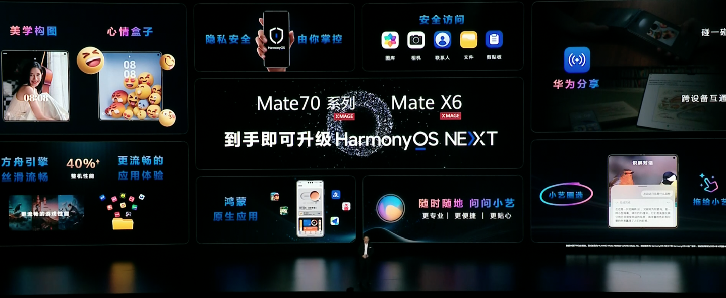 据IT之家今日早些时候报道,余承东在华为 Mate 品牌盛典上表示,Mate 70 系列 / X6 手机提供鸿蒙 4.3 和原生鸿蒙 5.0 两个选择,明年华为推出的所有手机平板都将搭载原生鸿蒙。