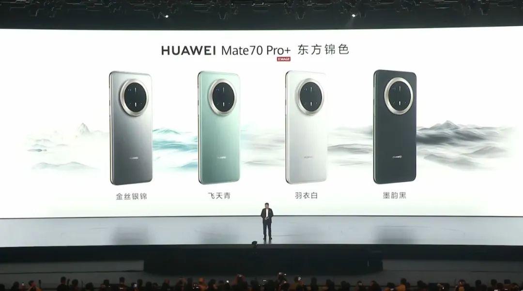 Mate 70、70 Pro,拥有曜石黑、雪域白、云杉绿和风信紫四种配色。Mate 70 Pro+,提供金丝银锦、飞天青、羽衣白、墨韵黑四种配色,灵感分别来自丝绸云锦、飞天舞蹈、《霓裳羽衣曲》、泼墨山水画。