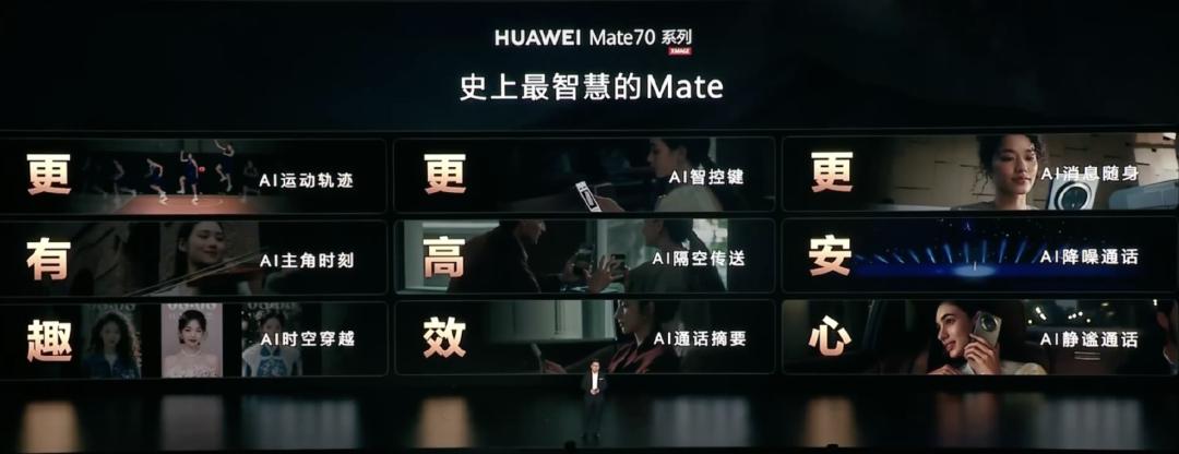 其中,最为重磅的,是Mate 70系列。发布会上,华为常务董事、终端BG董事长余承东放言,“能超越Mate的,只有Mate”。他用“最精致”“最强悍”“最出彩”“最智慧”来形容Mate 70,分别对应其外观设计、综合性能、影像技术和AI能力。
