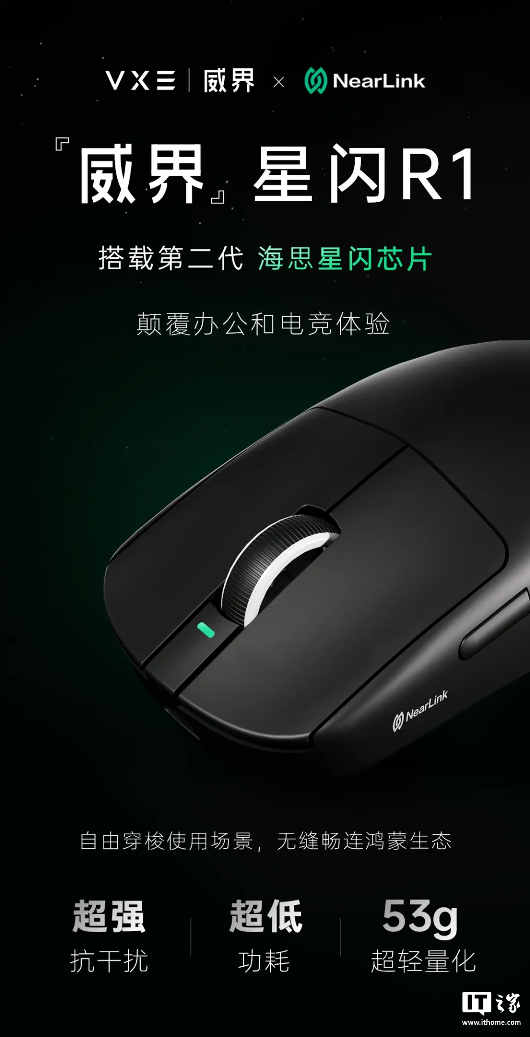 威界 VXE 星闪 R1 鼠标基于此前发布的蜻蜓 R1 鼠标系列,搭载第二代华为海思星闪芯片,采用 NearLink 星闪无线通信技术。