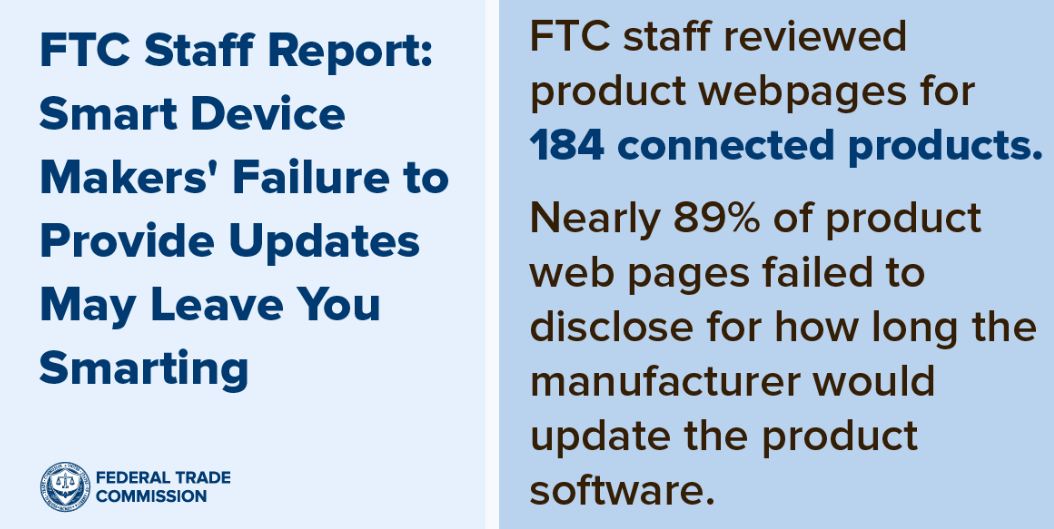 美国联邦贸易委员会称,如果制造商声称设备可以使用多长时间,而不向消费者提供软件更新信息,则可能违反了《美国联邦贸易委员会法》;