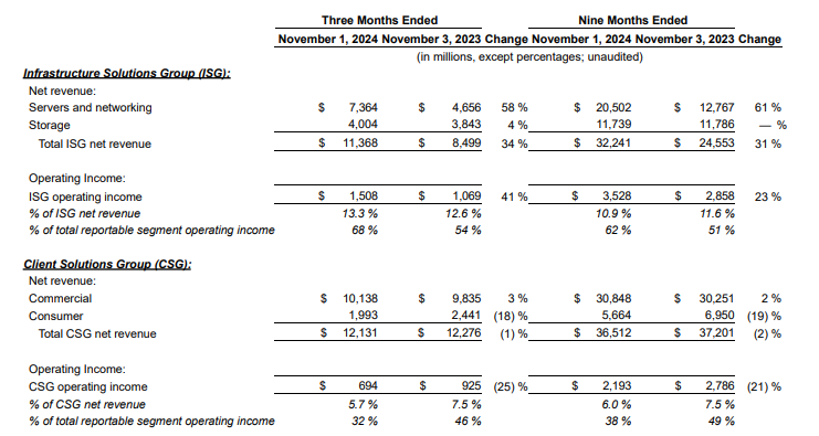 戴尔表示,本季度基础设施解决方案集团 (ISG) 收入为 114 亿美元,同比增长 34% 创历史新高,其中服务器和网络收入为 74 亿美元,增长 58%。存储业务收入为 40 亿美元,同比增长 4%。营业收入为 15 亿美元。