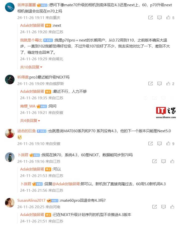 博主在评论区中对此进行解释:针对网友询问 Mate 60 Pro 手机从 HarmonyOS NEXT 版本回退后是否会推送鸿蒙 4.3 版本,博主称“已在 NEXT 升级计划序列的机型不会推送 4.3 版本”。