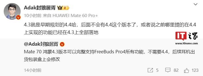 此外,该名博主还对 HarmonyOS 4.3 版本作出解释,称“4.3 就是早期规划的 4.4 哈,后面不会有 4.4 这个版本了,或者说之前哪里提的在 4.4 上实现的功能已经在 4.3 上全部落地”。