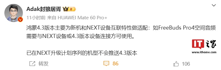 IT之家 11 月 27 日消息,博主 @Adak封狼居胥 昨日发文透露,鸿蒙 HarmonyOS 4.3 版本主要为新机和 NEXT 设备互联特性做适配。已在 NEXT 升级计划序列的机型不会推送 4.3 版本。