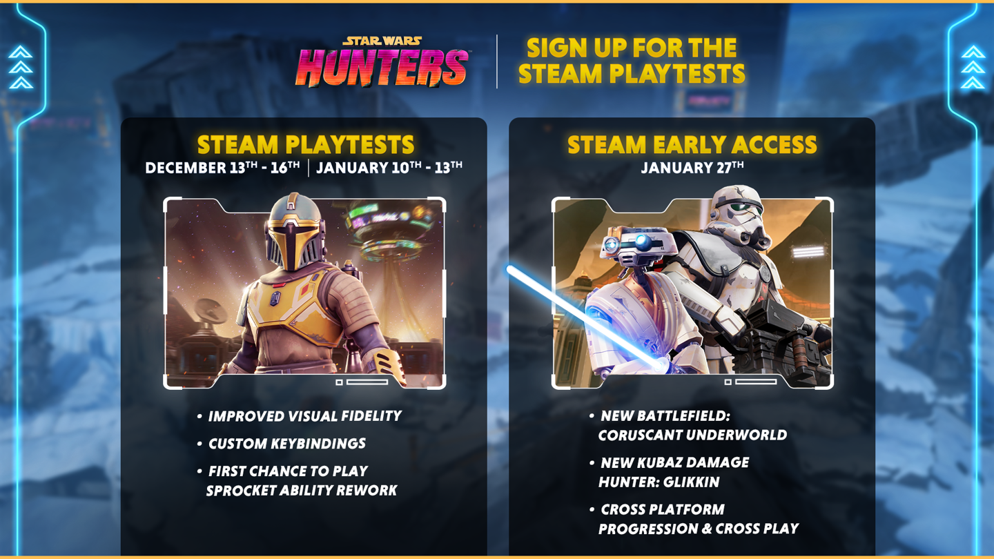 《星球大战:银河猎手》将在 1 月 27 日 PC 上线时新增战场“科洛桑地下世界”和新的库巴兹伤害猎人 Glikkin,并支持跨平台进度和跨平台游戏。