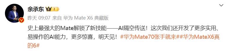 而在发布会内容上,华为并不像Ov一样提前很久就已经到处宣传功能、被数码博主们“扒”得干干净净,在发布会前一日,余承东也只转发了一条华为终端展示AI隔空投送的功能,并配文“这次我们还开发了更多实用、易操作的AI能力”,可以说是将悬念留到了最后一刻。