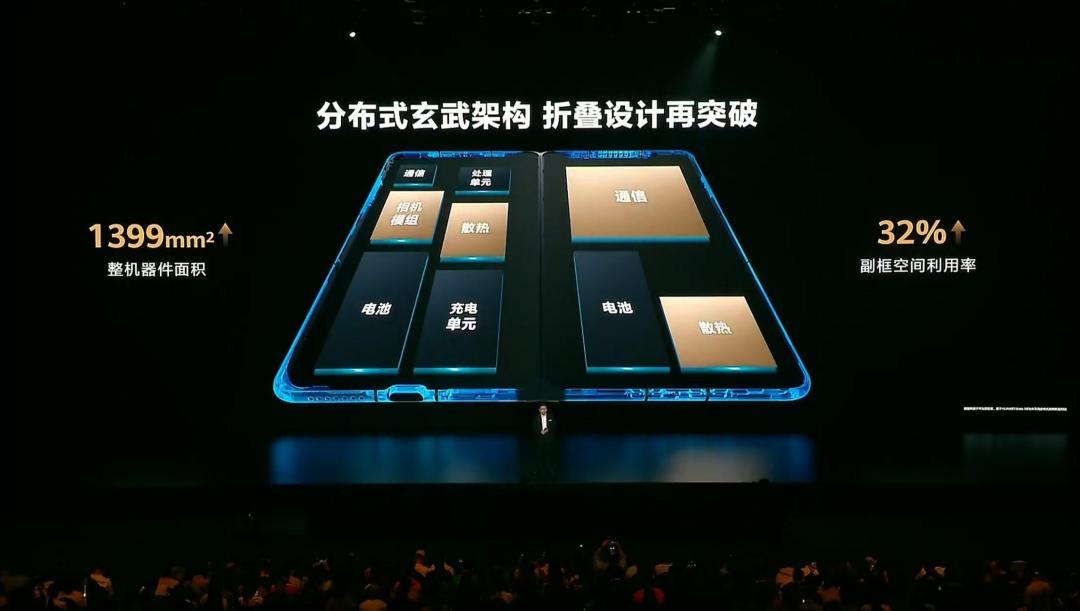 性能方面,Mate X6采用了全新的分布式玄武架构,重新排布了手机内部的电子器件,增加了整机电子器件的面积,将副框空间利用率提升接近了三分之一。