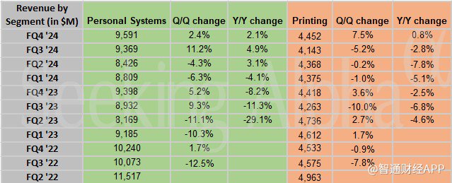 惠普(HPQ.US)公布2024财年第四季度业绩。数据显示,该公司Q4营收同比增长1.7%至141亿美元,略高于市场预期,这是该公司连续第二个季度实现营收同比增长,此前连续八个季度下滑;不计部分项目的每股收益为0.93美元,符合市场预期。