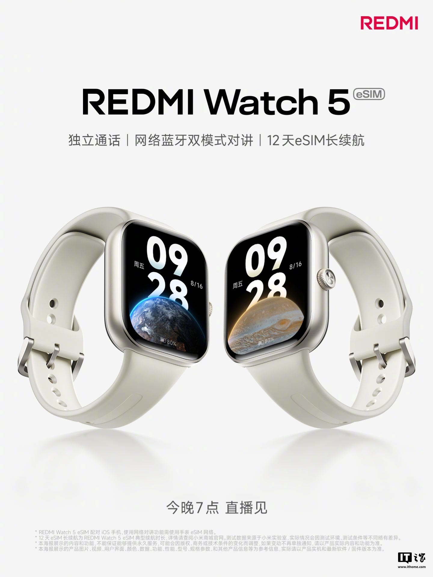 REDMI Watch 5 eSIM 版手表将于今日(11 月 27 日)19:00 正式发布,IT之家全程视频直播,敬请期待。