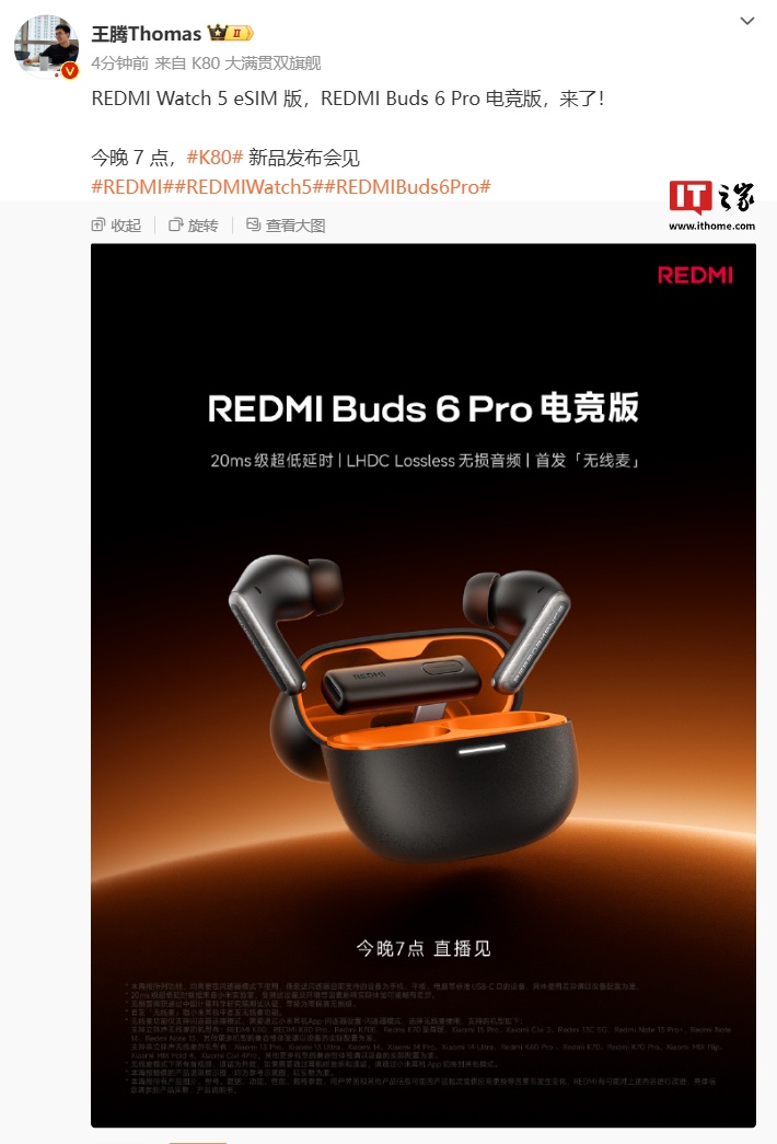 IT之家 11 月 27 日消息,小米官方今日持续预热新品,除 REDMI Watch 5 eSIM 版手表外,还将带来小米 REDMI Buds 6 Pro 电竞版无线耳机。