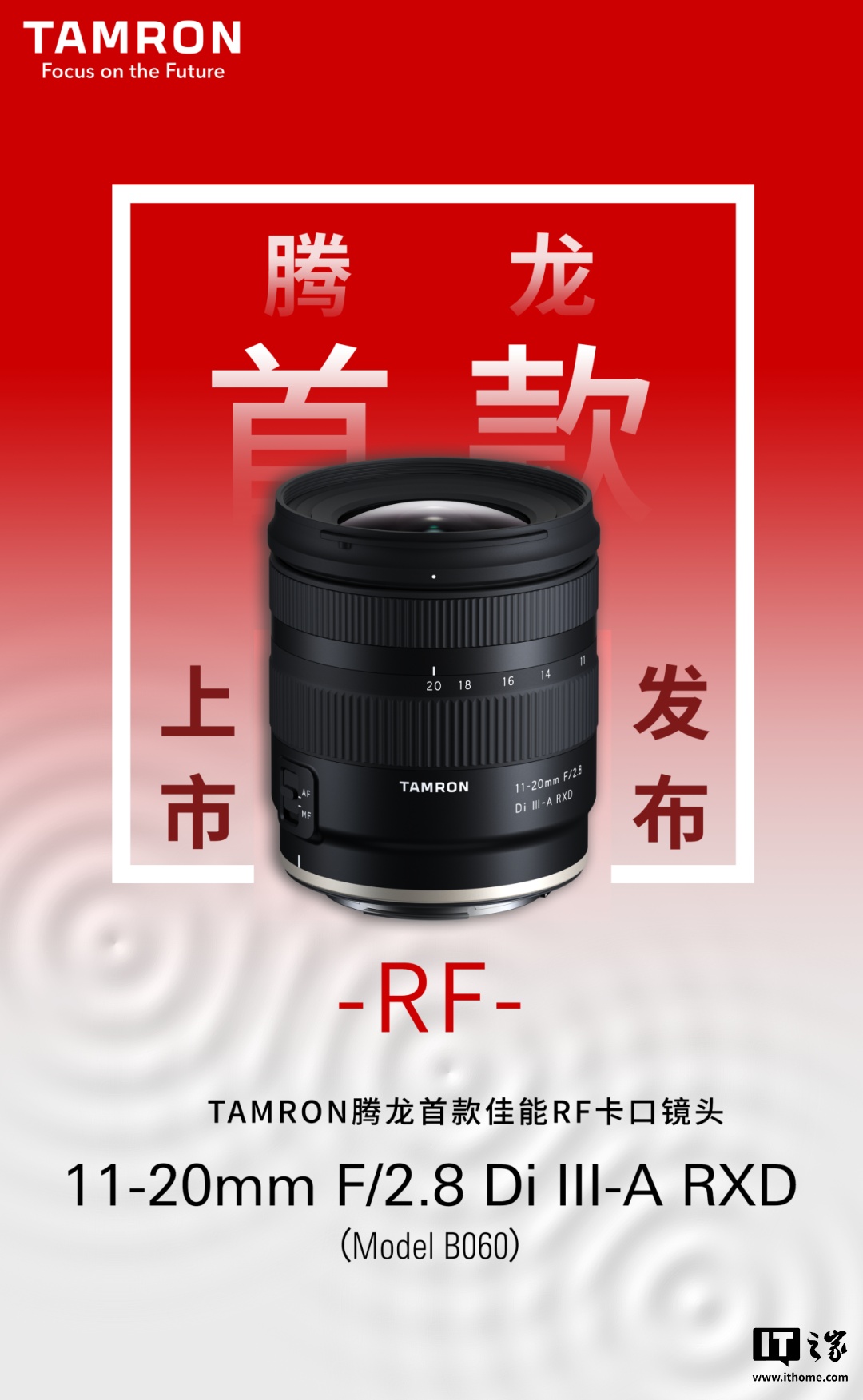 IT之家 11 月 27 日消息,腾龙今日官宣,将于 2024 年 12 月 12 日推出该公司首款佳能 RF 卡口镜头 11-20mm F/2.8 Di III-A RXD(型号 B060)—— 适用于 APS-C 画幅无反相机的大光圈超广角变焦镜头 (以下简称 11-20mm F2.8)。