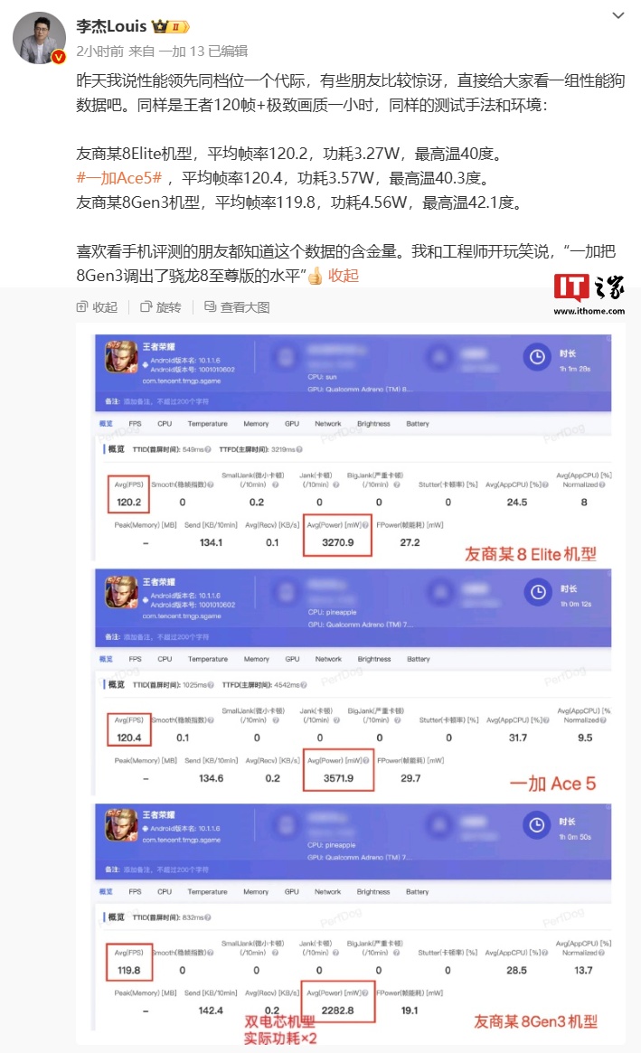 一加中国区总裁李杰今日发文公布了 Ace 5 系列手机玩《王者荣耀》手游的性能表现:在 120 帧 + 极致画质下,一加 Ace 5 手机平均帧率 120.4、功耗 3.57W、最高温 40.3 度。
