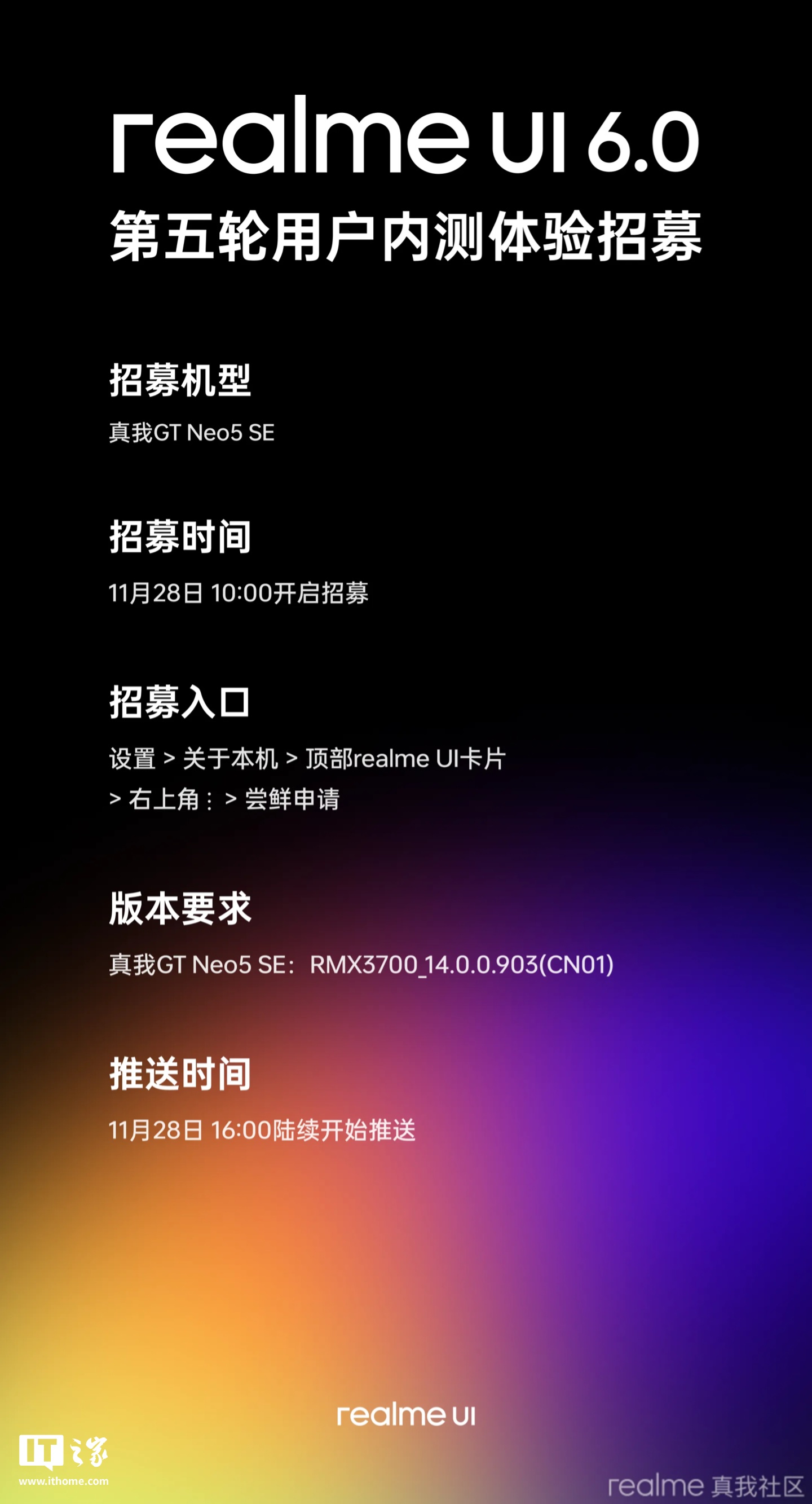 IT之家 11 月 27 日消息,realme UI 官方今日宣布,realme UI 6.0 第五轮内测用户招募将于 11 月 28 日正式开启,选定真我 GT Neo5 SE 作为第五轮招募机型。