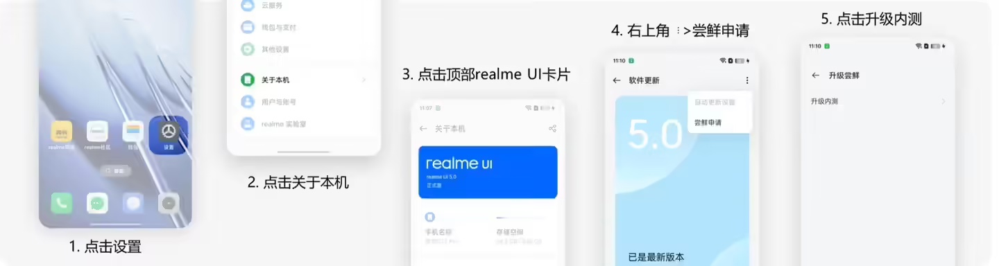 招募入口:设置 > 关于本机 > 顶部 realme UI 卡片 > 右上角 ⋮ > 尝鲜申请