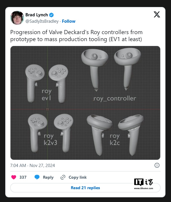 IT之家 11 月 27 日消息,有网友在 SteamVR 驱动文件中发现了 Valve 神秘 VR 头显 Deckard 的控制器模型“Roy”,揭示其设计和输入方式。