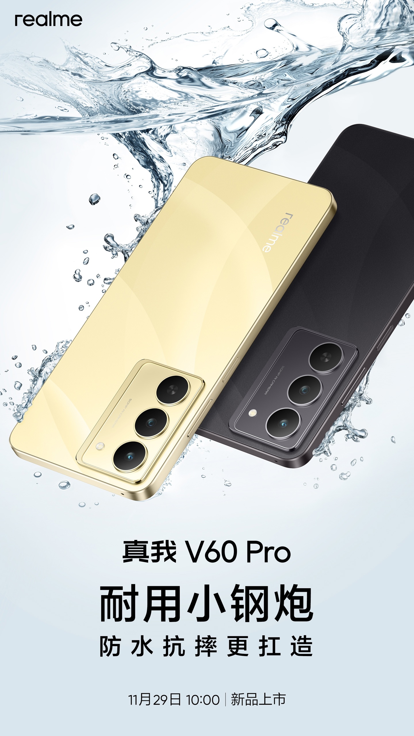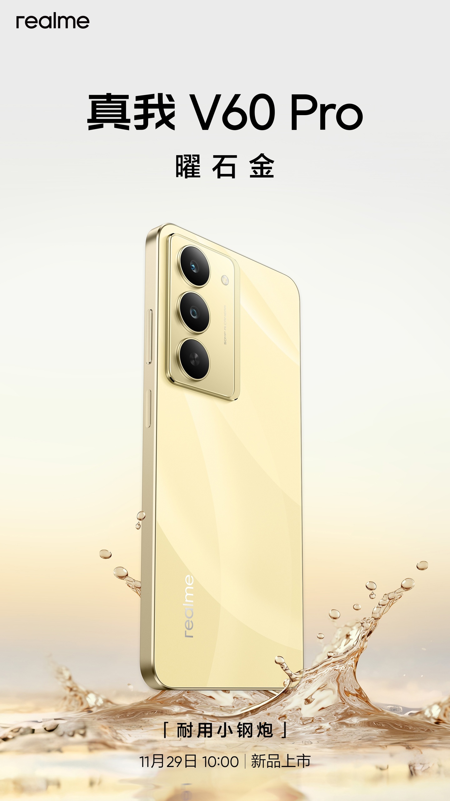 IT之家 11 月 27 日消息,真我手机今日发文官宣,realme 真我 V60 Pro 手机将于 11 月 29 日 10:00 上市,新机拥有曜石金 / 磐石黑两种配色,采用立边设计,号称“耐用小钢炮”。