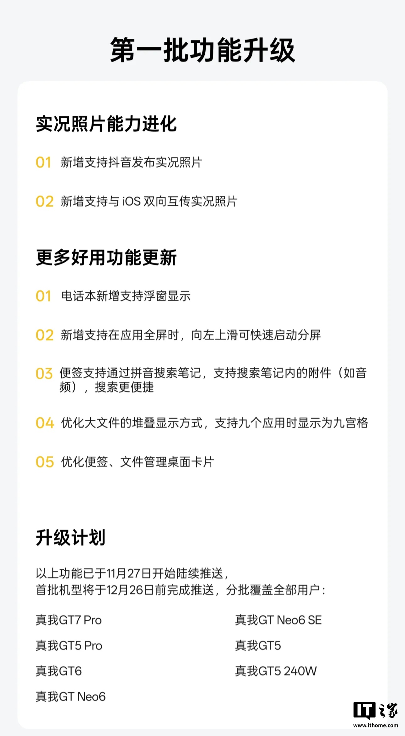 IT之家 11 月 27 日消息,真我官方今日公布 realme UI 系统 11 月体验升级计划,本月新增支持抖音发送实况照片、与 iOS 双向互传实况照片等功能。