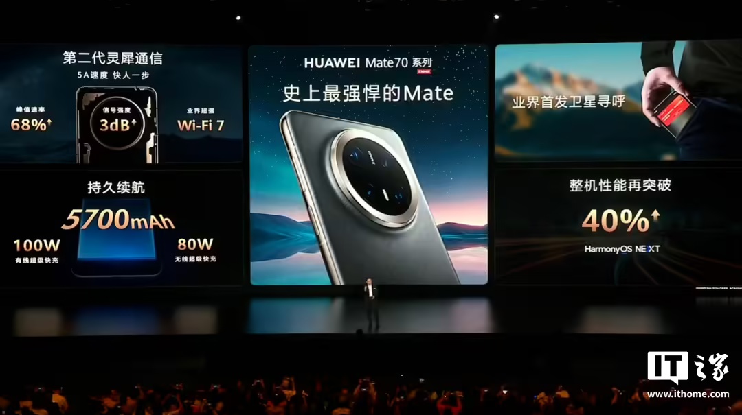 Mate 70 内置 5300mAh 电池,支持 66W 有线快充和 50W 无线快充。Pro 和 Pro+ 则分别为 5500mAh / 5700mAh,支持 100W 有线快充和 80W 无线快充。
