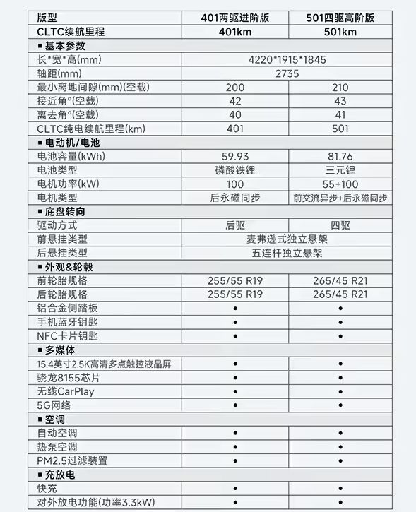 该车提供两种动力系统,一种为最大功率 100kW 的单电机,采用磷酸铁锂电池;另一种则是最大功率为 100kW+55kW 的双电机,采用三元锂电池。
