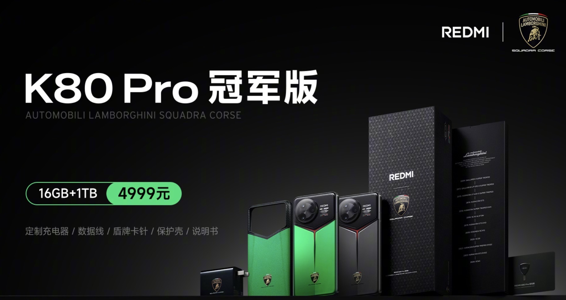 与兰博基尼合作的冠军版也同期发布,K80 Pro 冠军版灵感源自 LAMBORGHINI Huracán GT3 EVO2,售价4999元。