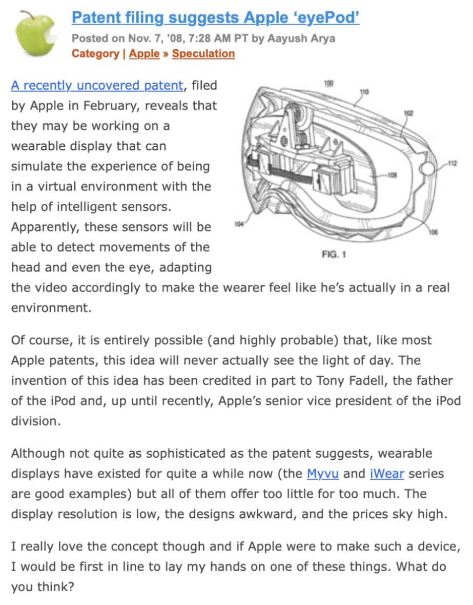 这项专利申请由 Macworld 的 Dan Moren 报道,原文由 Aayush Arya 于 2008 年 11 月 7 日撰写。 目前还不清楚为什么莫伦会想起这项专利,但我们可以更清楚地了解苹果 Vision Pro 的梦想实现了多久。 下文提到了这项专利的细节,报告还指出,就像该公司的大多数专利一样,这项专利有可能永远不会见天日。 幸运的是,苹果公司逆流而上,实现了 AR 头显,尽管价格不菲。