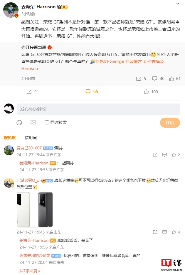 荣耀终端有限公司中国区 CMO 姜海荣今日发文回应了新系列机型命名问题:荣耀 GT 系列不是针对谁,第一款产品名称就是“荣耀 GT”。另外他还表示“新荣耀 GT,性能有大招”。