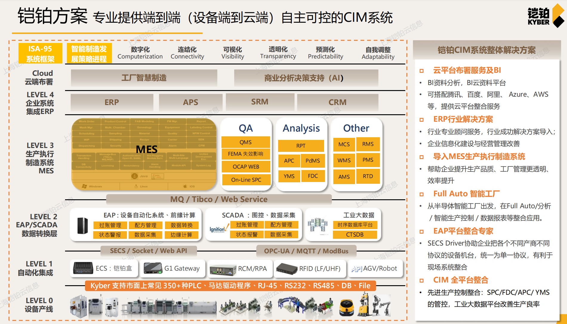 近年来,随着半导体技术的飞速发展,市场对智能制造的需求日益迫切。铠铂凭借先进的技术积累,自主研发了“Kyber- MOM/CIM 智能制造运营管理平台”“Kyber-IIoT工业物联网平台”“Kyber Designer 共工开发台”以及“Kyber ESG双碳管理平台”四大平台产品。这些产品已在PCB、半导体、新能源及汽车零部件等多个行业展现出卓越实力。结合“SAP ERP 企业管理系统”铠铂能够为制造业者提供从底层物联到智能制造管理端对端的数字化工厂整体解决方案,助力企业实现智能制造转型升级。