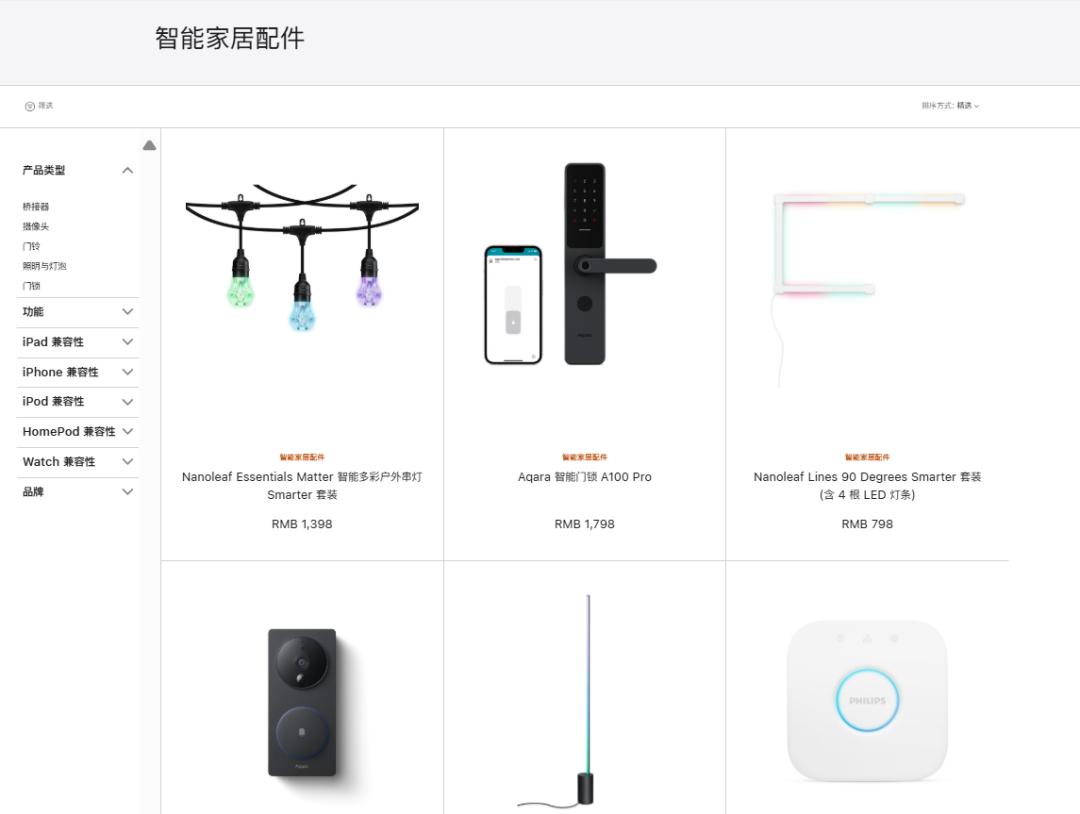 上面这张是苹果官网上的智能家居配件选购页,我简单数了一下,划到页面最底下也一共只有13个产品,而且这里面基本上除了网关就是灯具,这品类丰富度已经谈不上覆盖了,它是连最基础的支持都没有啊。