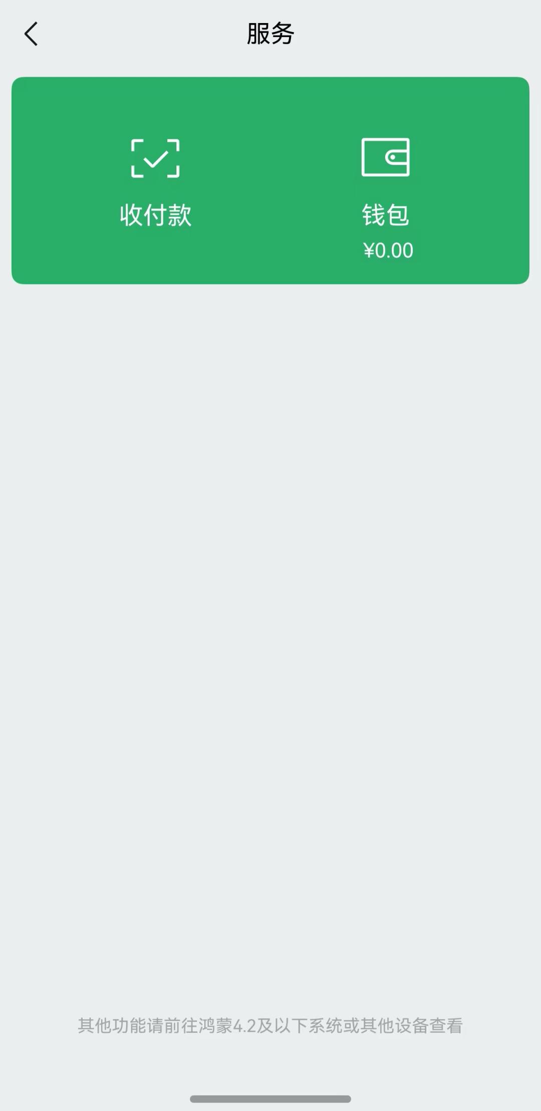 无独有偶,目前原生鸿蒙版微信的服务功能只有收付款和钱包,不提供九宫格,并且不支持发群红包,日常使用同样存在不小的问题。