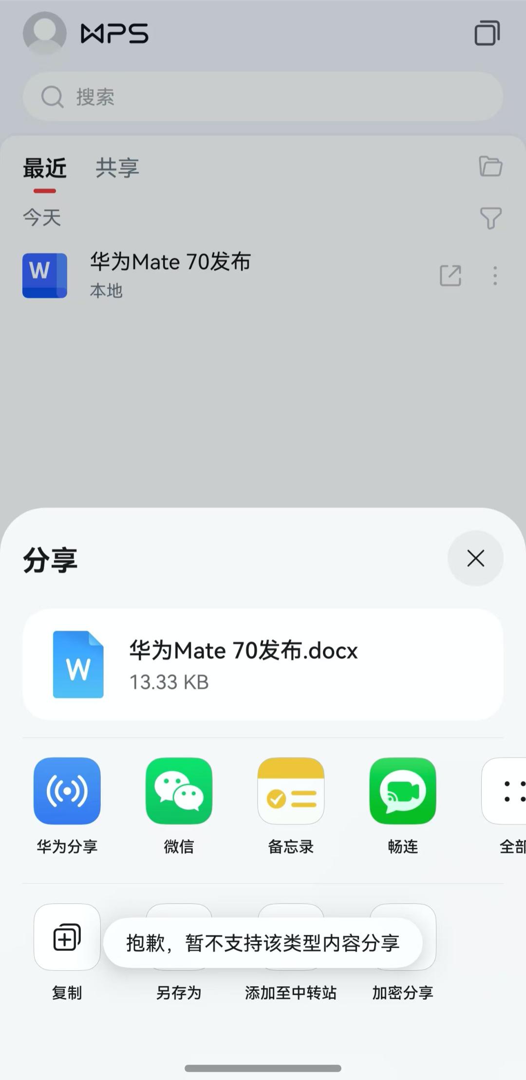 事实上,即便已经适配原生鸿蒙,部分App的体验也存在不小的短板。以原生鸿蒙版WPS为例,其虽然可以正常编辑文字,但却无法分享文件到其他应用,非常影响日常办公体验。