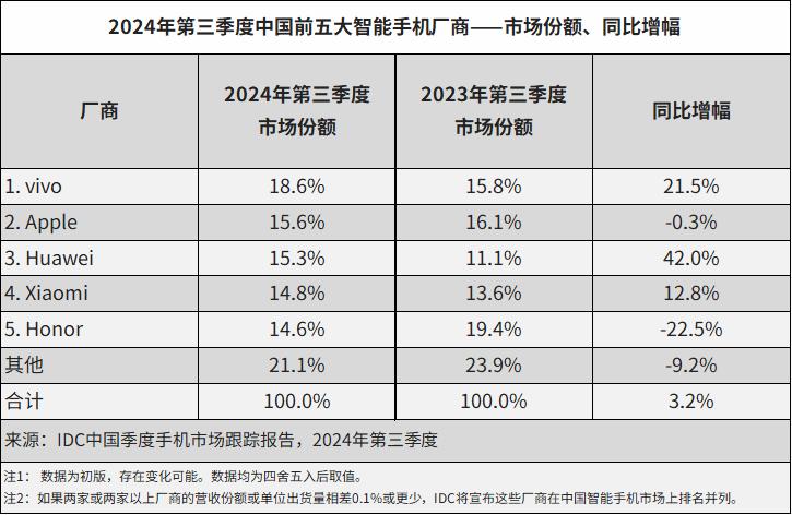 IDC数据显示,2024年Q3中国手机市场,华为手机出货量同比增长42%,市占率为15.3%,位居第三。调研机构CINNO Research披露的数据显示,预计华为Mate 70系列的总销量将达1500万部左右。随着Mate 70和Mate X6 系列上市,2024年Q4,华为手机的市占率有望冲击中国市场第一。