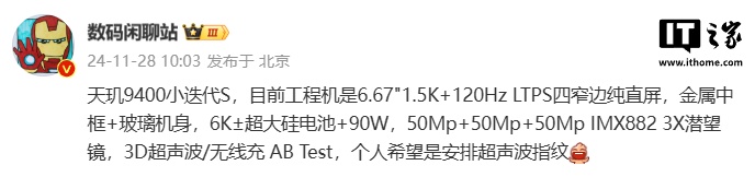 IT之家 11 月 28 日消息,博主 @数码闲聊站 今日曝光一款天玑 9400 小迭代 S 工程机参数,评论区网友推测了为 vivo X200s 系列。