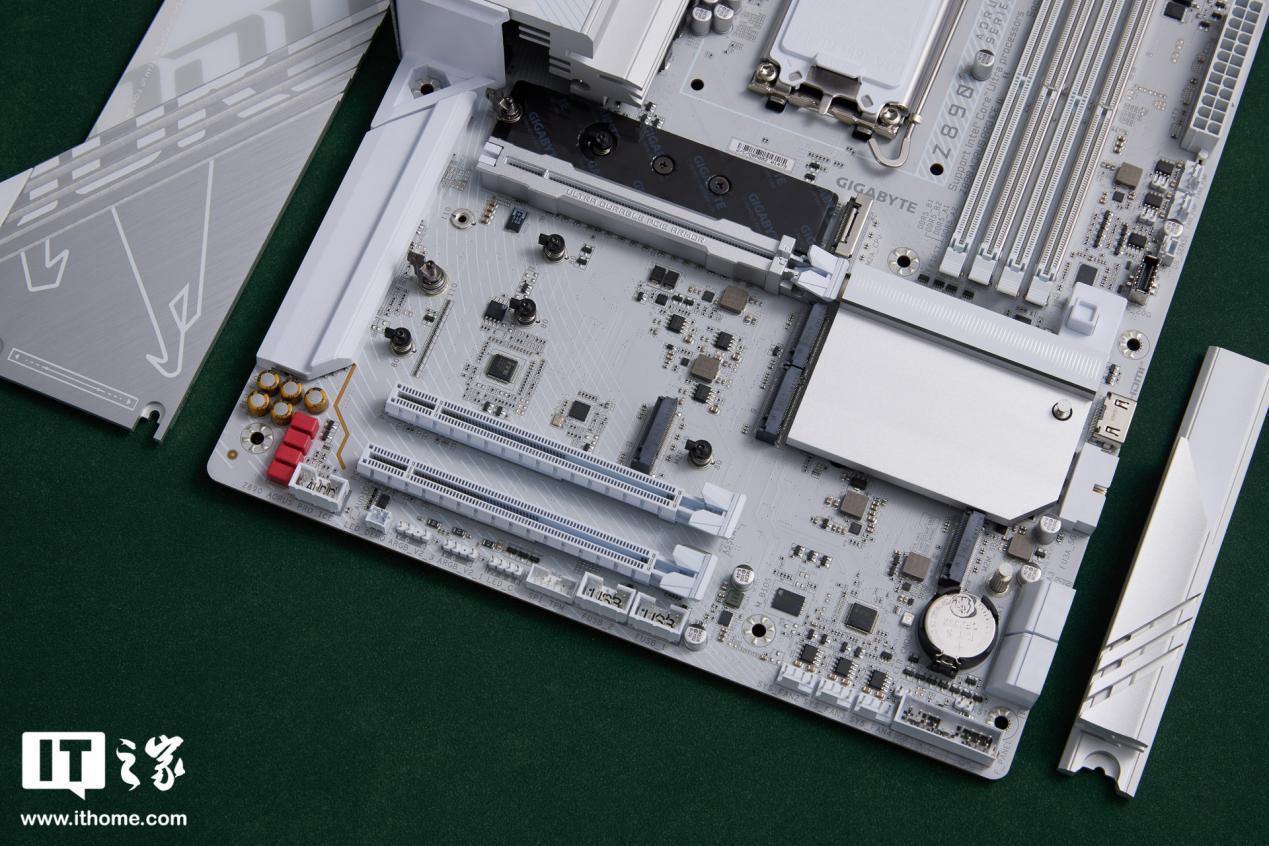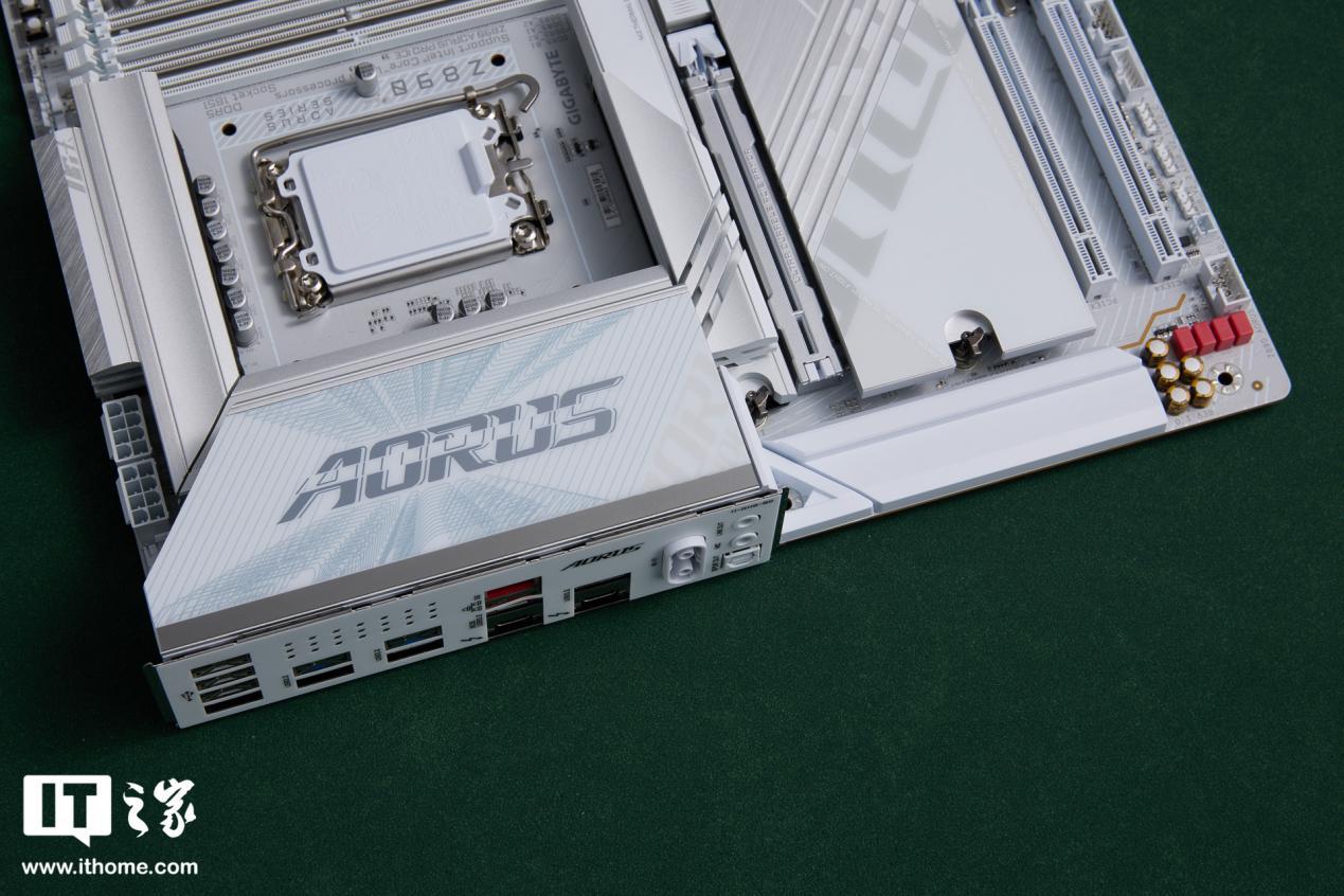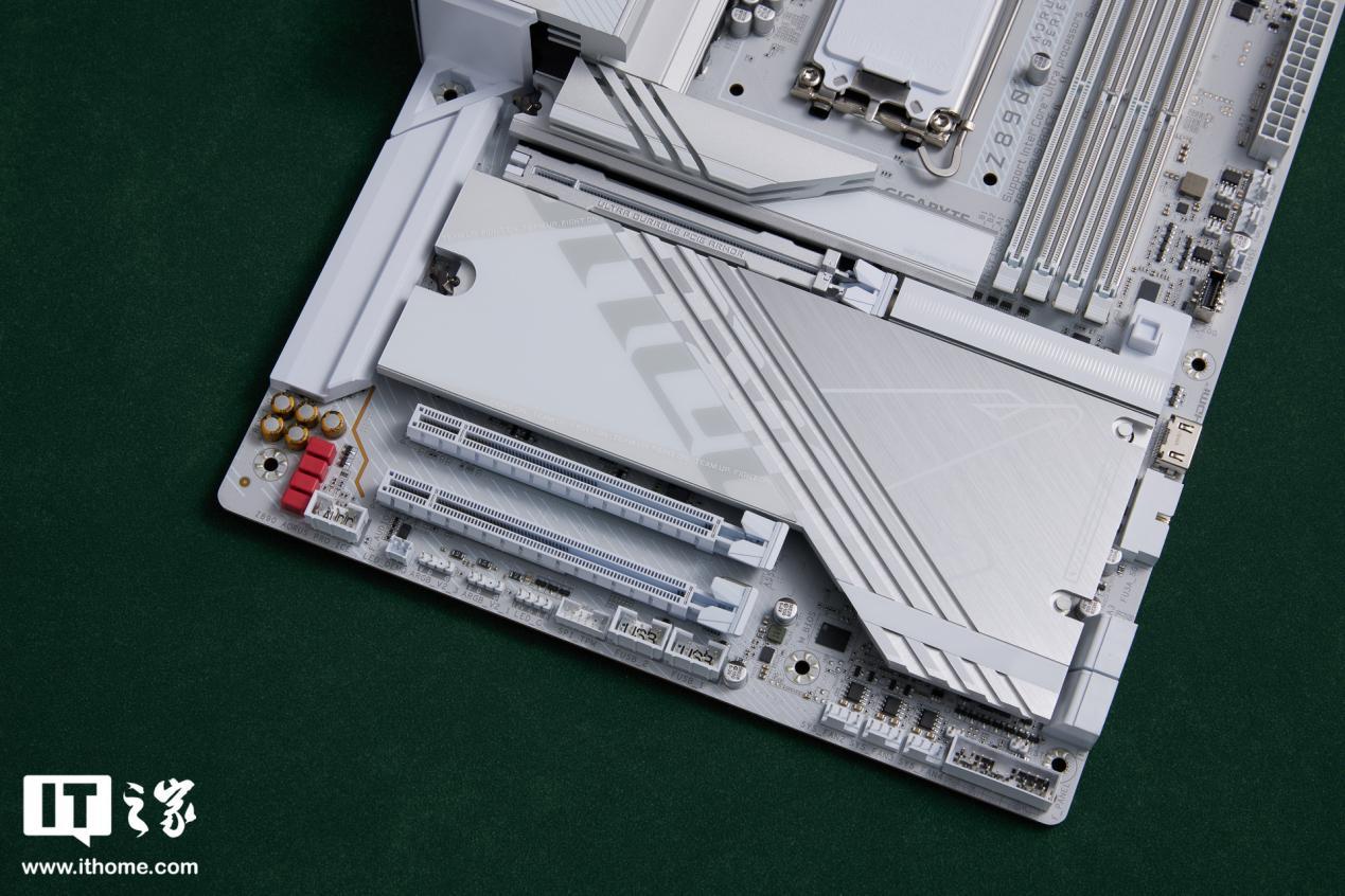 技嘉 Z890 AORUS PRO ICE 主板采用纯白设计,白色的 PCB 板配合银色散热装甲,色调十分统一。散热装甲有线条凹槽装饰,不仅美观还能进一步加速散热。