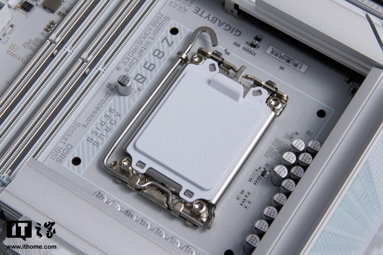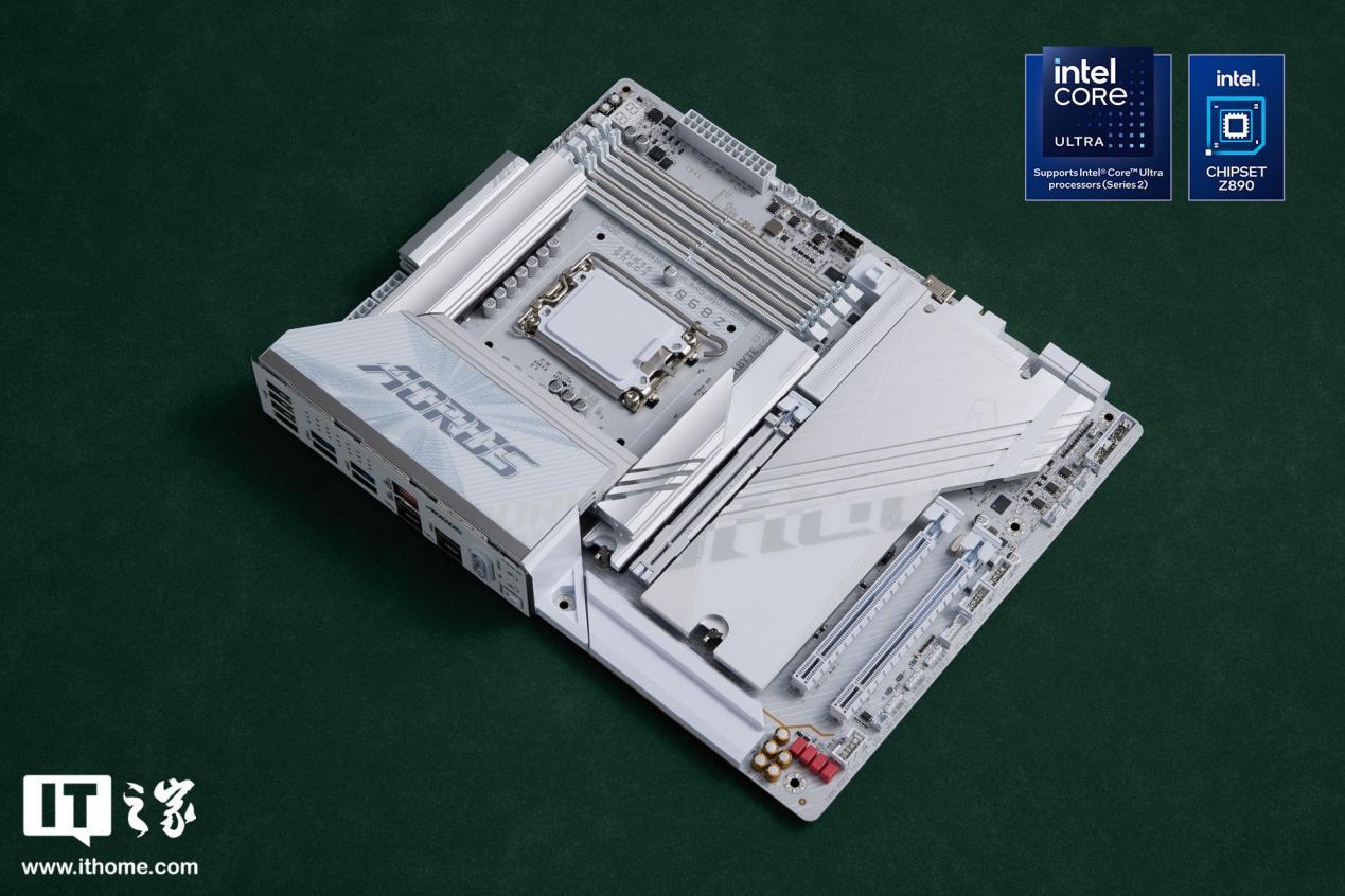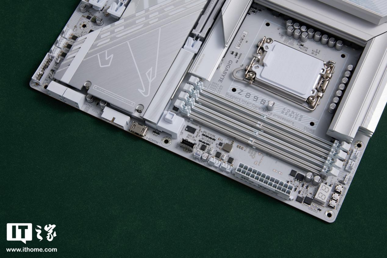 技嘉 Z890 AORUS PRO ICE 主板采用纯白设计,白色的 PCB 板配合银色散热装甲,色调十分统一。散热装甲有线条凹槽装饰,不仅美观还能进一步加速散热。