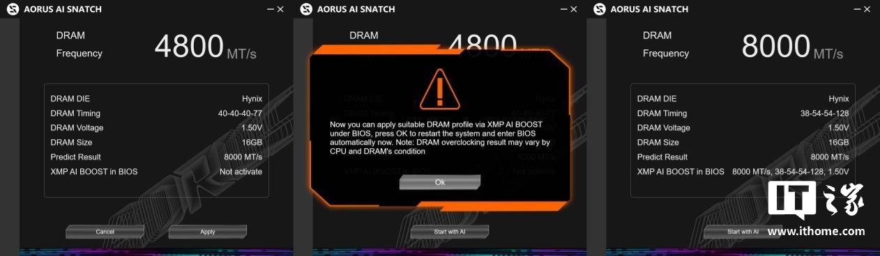 目前我们手上频率最高的是 8000MT/s 的雷克沙战神之翼内存,AI 推荐了 7600MT/s 与 8000MT/s 两档设置,我们设置为 8000MT/s,并与 4800MT/s 的默认频率做对比测试。