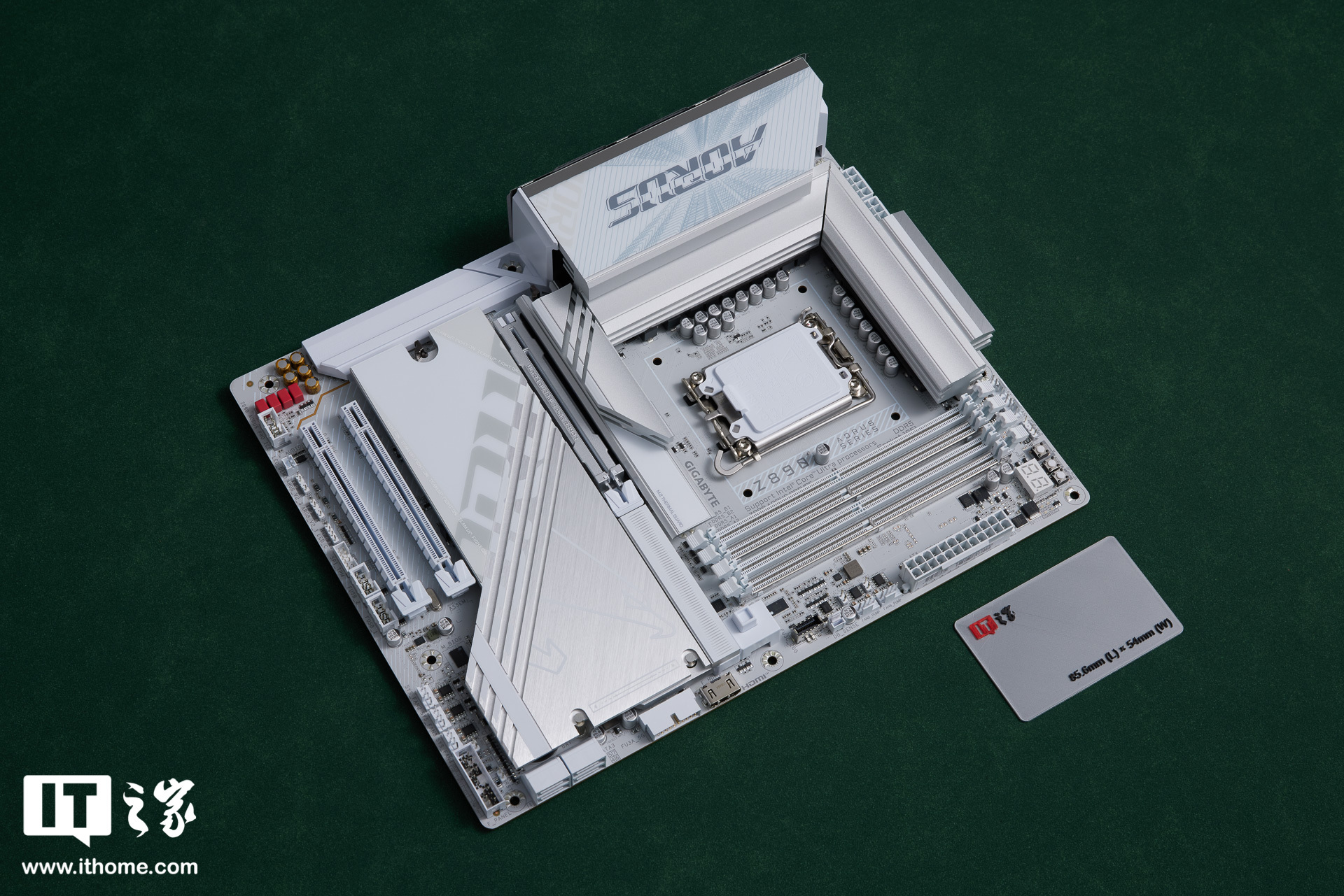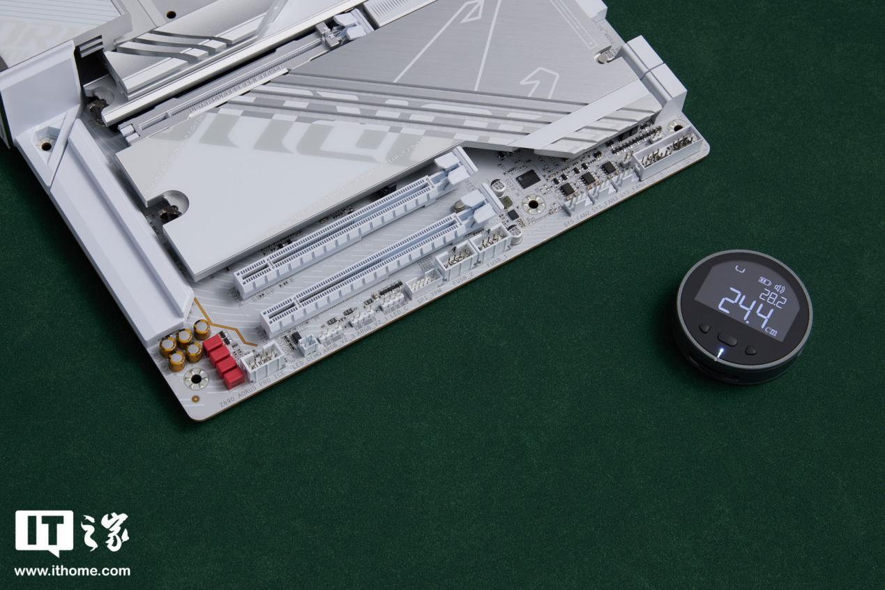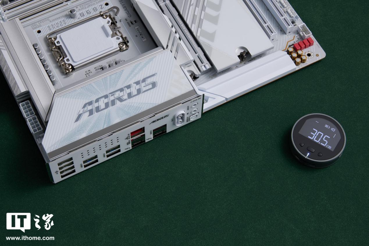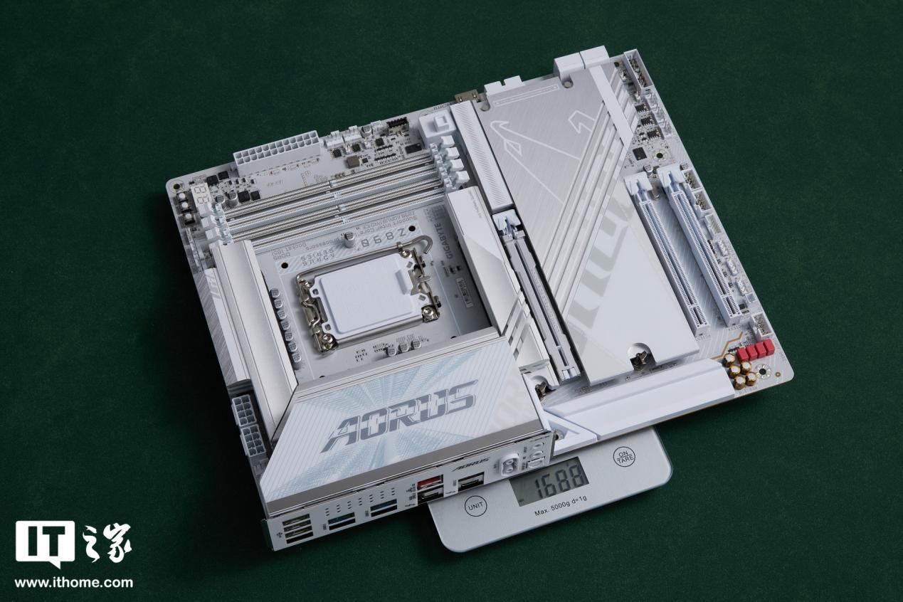 技嘉 Z890 AORUS PRO ICE 主板为标准的 ATX 大板,尺寸方面IT之家实测长和宽分别为 30.5cmx24.4cm,上秤裸板重量约为 1.69kg。