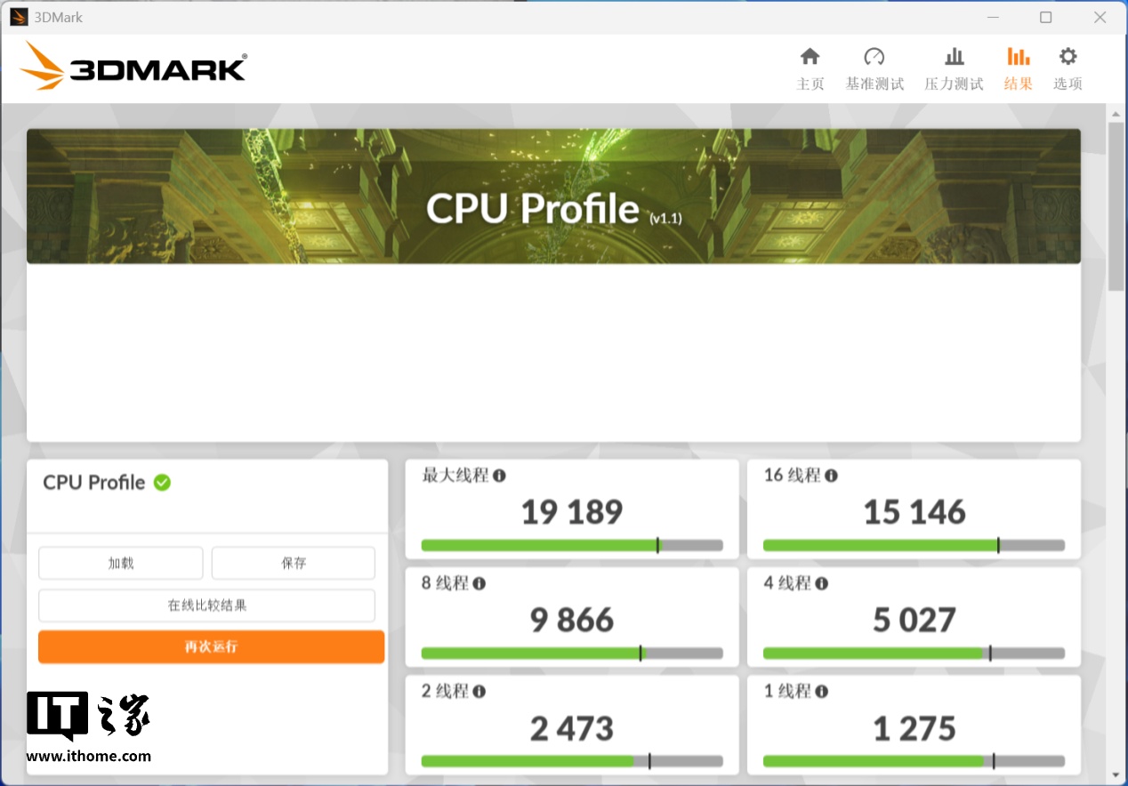 在 3D Mark CPU Profile 的测试中,酷睿 Ultra 9 285K 最大线程分数为 19189 分,单线程分数 1275 分。