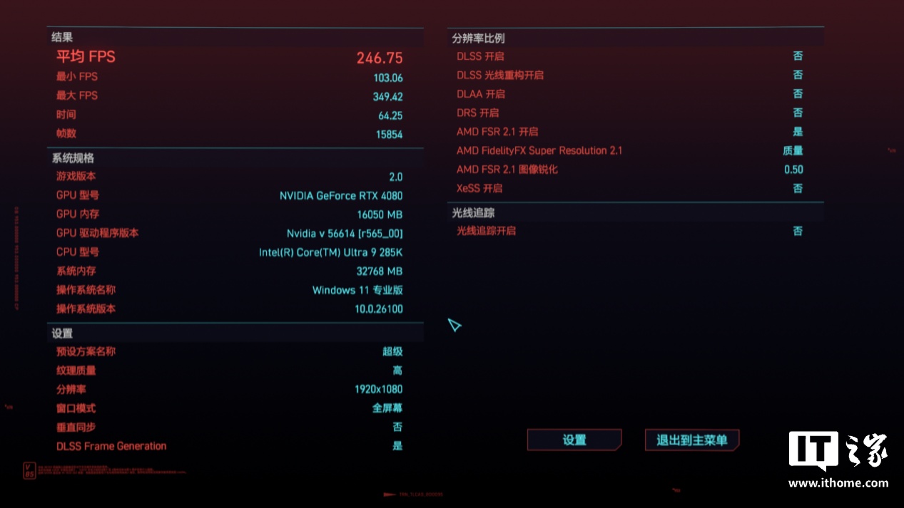 第四款是《赛博朋克:2077》,选择 1080P 分辨率 + 超级画质运行游戏自带基准测试,酷睿 Ultra 9 285K 游戏平均帧数为 246.75 帧,1% Low 帧 103.06 帧。