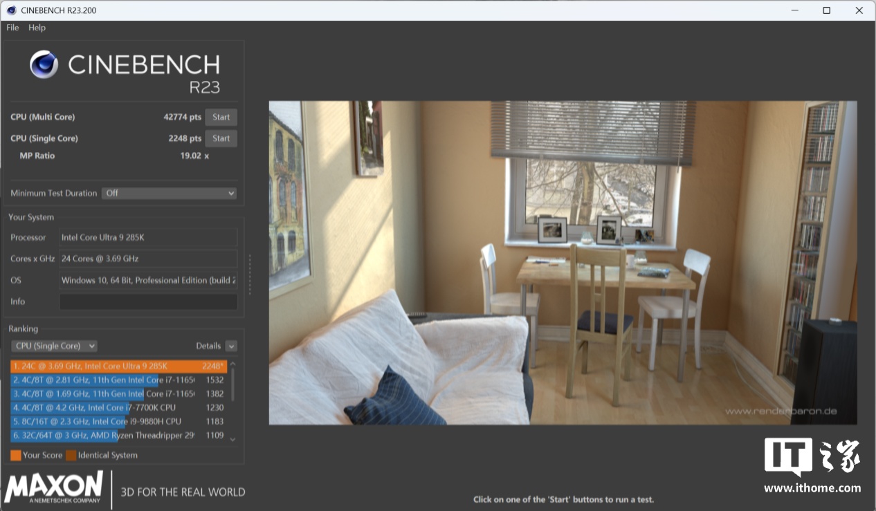 在 CineBench R23 的测试中,酷睿 Ultra 9 285K 跑出了单核 2248 分,多核 42774 分的成绩,单核多核表现都比较亮眼。