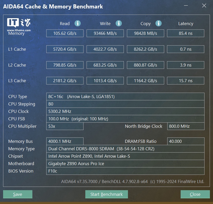 通过技嘉 Z890 AORUS PRO ICE 主板的 AI D5 黑科技 2.0 功能,内存能够跑满 8000MHz,读写性能大幅提升,延迟也有一定下降。
