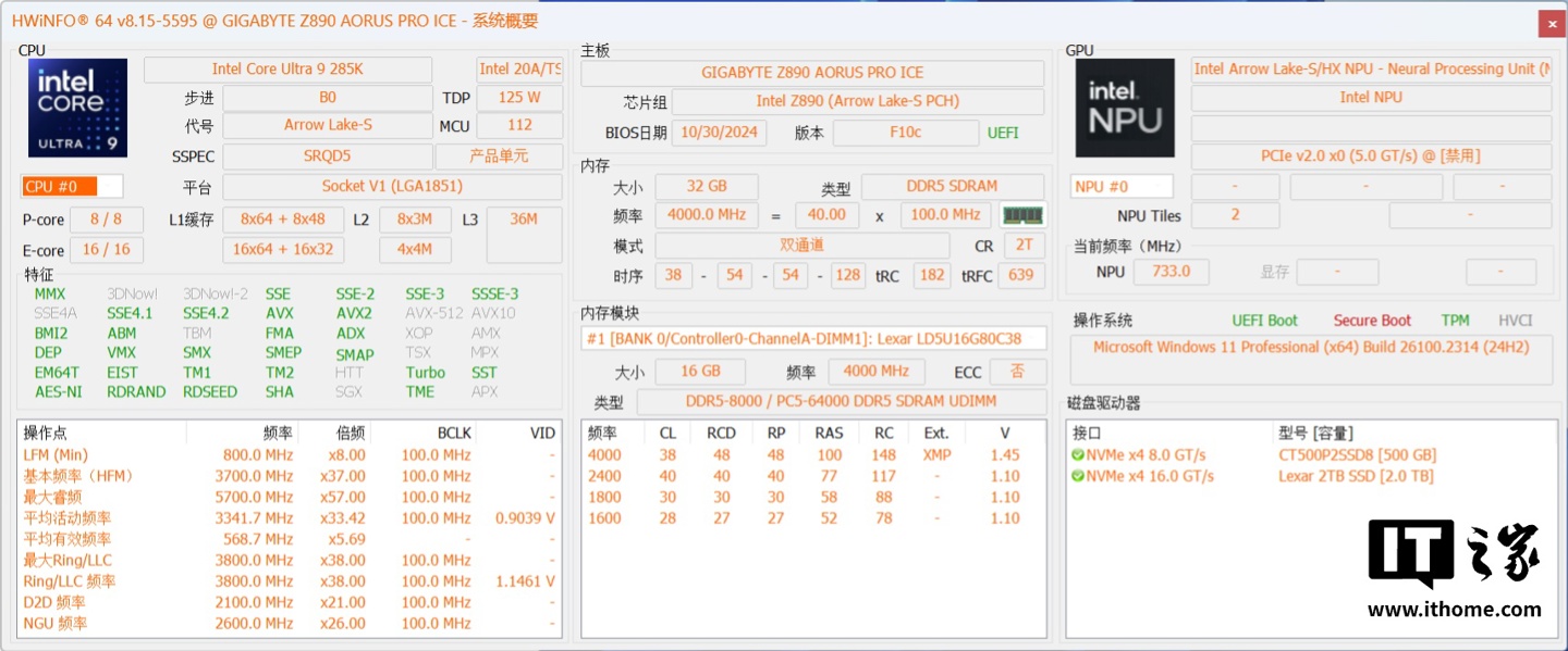 本次测试的酷睿 Ultra 9 285K 配备了 24 核心 24 线程,包括 8 个高性能 P 核心和 16 个高能效 E 核心,基础 TDP 为 125W,最大睿频功率为 250W,L2 缓存增加到了 40MB,L3 缓存为 36MB,与前代保持一致。P 性能核心工作频率范围是 3.7-5.5GHz,E 能效核心工作频率范围是 3.2-4.6GHz 频率。