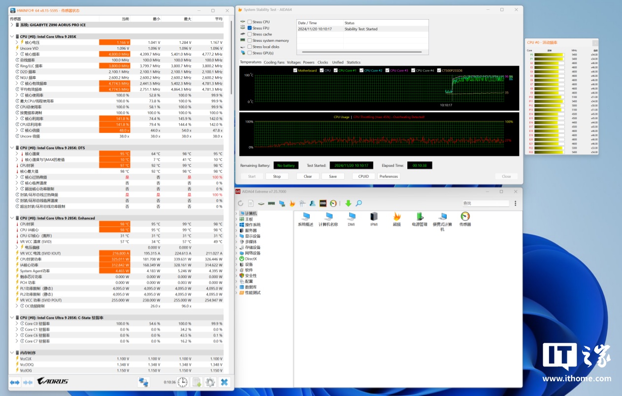 先看烤机,由于技嘉 Z890 AORUS PRO ICE 主板的 BIOS 功耗策略比较激进,PL1 直接给到 190W,开启 O 模式后 PL1 也不做功耗限制。所以烤机一开始 CPU 功耗就直接来到了 339.6W,CPU 温度也一下冲上了 98°C。不过随后 CPU 温度就降到了 95°C 左右,CPU 功耗也快速稳定在 325W 附近。烤机 10 分钟后,此时 CPU 的 P 核频率最高达到了 5.4GHz,E 核频率则在 4.6GHz 左右,轻松释放 Ultra 9 285K 的全部性能。