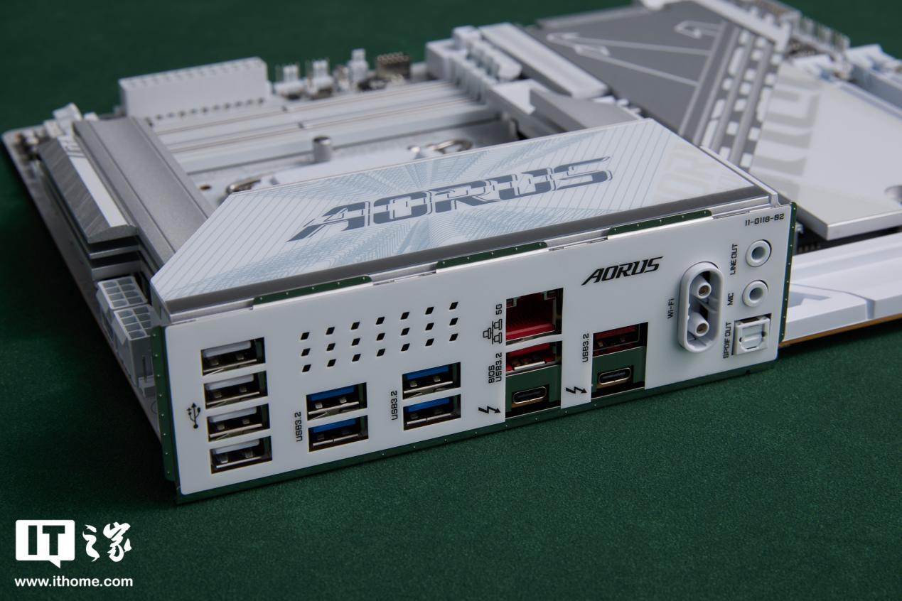 I/O 接口方面,技嘉 Z890 AORUS PRO ICE 主板提供 4 个 USB 2.0 白色 A 口,4 个 USB3.2 Gen1 蓝色 A 口,2 个 USB 3.2 Gen2 的橙色 A 口,2 个支持 DP 输出的双雷电 4 的 C 口,1 个 5 千兆 RJ45 网口,1 个光纤音频口以及 1 组音频接口组。