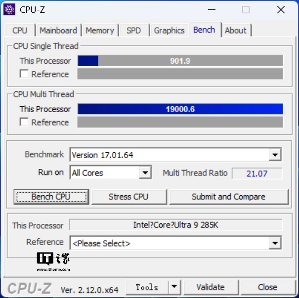 接下来进入理论性能实测,在 CPU-Z 自带的跑分测试中,酷睿 Ultra 9 285K 单核心 901.9 分,多核心 19000.6 分。