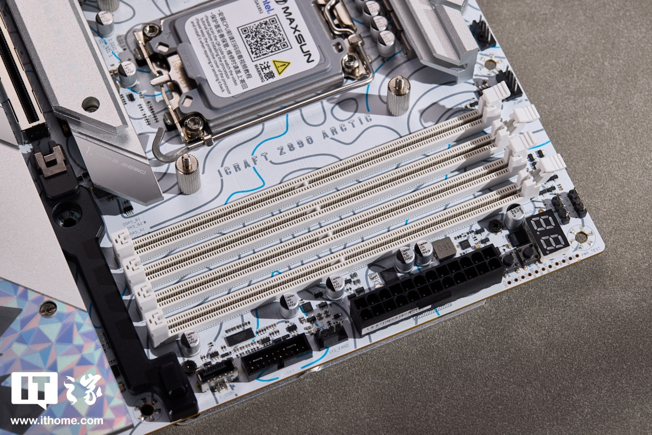 CPU 区域右侧为 4 条白色 DDR5 内存插槽,支持最高 9500MT/s 速率的内存,单条内存容量为 64GB,最大容量可扩展到 256GB。