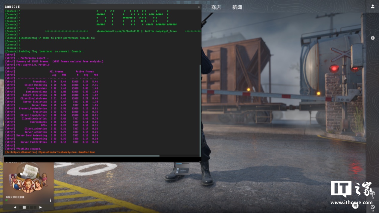 第一款《CS2》,以 1080P 分辨率 + 高画质运行创意工坊测试地图 CS2 FPS BenchMark。酷睿 Ultra 9 285K 游戏平均帧数为 449.5 帧,1% Low 帧 184 帧。