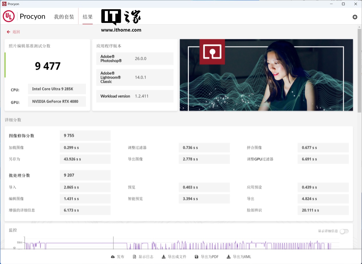 Procyon 的照片编辑基准测试可以调用 Adobe PhotoShop 与 Lightroom,对照片进行修改或批处理,其最终得分为 9477.