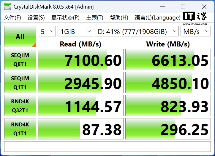 硬盘方面,我们测试了规格为 7450MB/s 顺序读取速度和 6500MB/s 顺序写入速度的雷克沙 NM800 Pro,在 41% 脏盘的情况下跑到了 7100.6MB/s 的顺序读取速度和 6613.1MB/s 的顺序写入速度,符合其应有的水平。