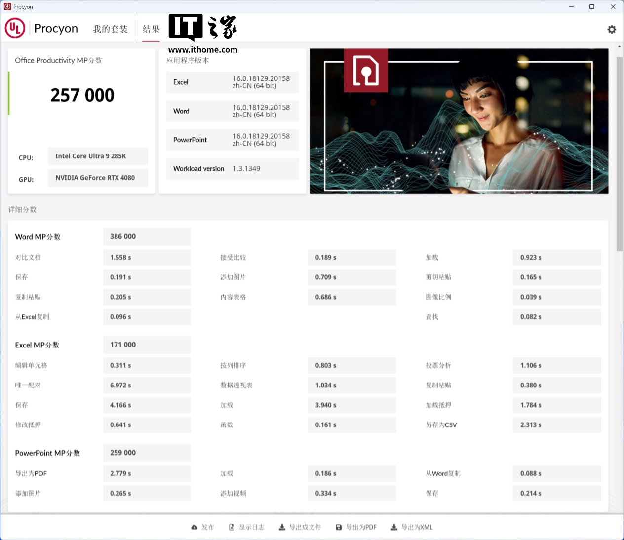 接下来再让我们看看,酷睿 Ultra 9 285K 搭配技嘉 Z890 AORUS PRO ICE 主板的生产力表现如何吧。这次我们主要使用 Procyon 进行生产力性能测试,这款软件可以调用用户安装的生产力软件,模拟办公操作,比较贴近日常使用场景。在不含 Outlook 的 Office Productivity MP 测试中,搭载技嘉 Z890 AORUS PRO ICE 的测试机获得了 257000 的分数,其中 Word 分数 386000,Excel 分数 171000,PowerPoint 分数 25900。